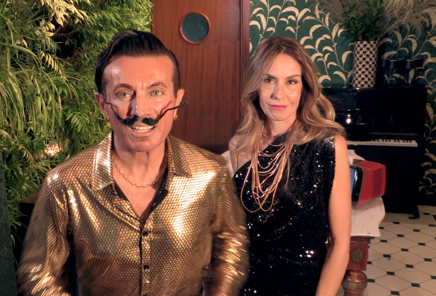 Insomma erano anni di sogni condivisi, fiducia collettiva e un fermento culturale che sembrava inarrestabile. Su questo sfondo si innesta il racconto del video, costruito come un viaggio simbolico tra passato e presente. Il filo conduttore è un televisore d’epoca sintonizzato sull’immaginaria “TV FUTURE”, un canale che idealmente trasmette frammenti del futuro già dagli anni ’80. Attraverso questo espediente narrativo, l’Amanda Lear interpretata dall’attrice Tiziana Ferlazzo osserva ciò che il tempo ha riservato al mondo. Al suo fianco, Maurizio Camuti, con i baffi che richiamano Salvador Dalí ,diventa una sorta di guida visionaria, un accompagnatore che le mostra, con un misto di stupore e malinconia, gli scenari del presente. Le immagini che scorrono sullo schermo rivelano un mondo radicalmente diverso da quello immaginato decenni fa: conflitti armati sempre più vicini, notizie di guerra che invadono quotidianamente radio e televisioni, tensioni che sembrano aver riportato